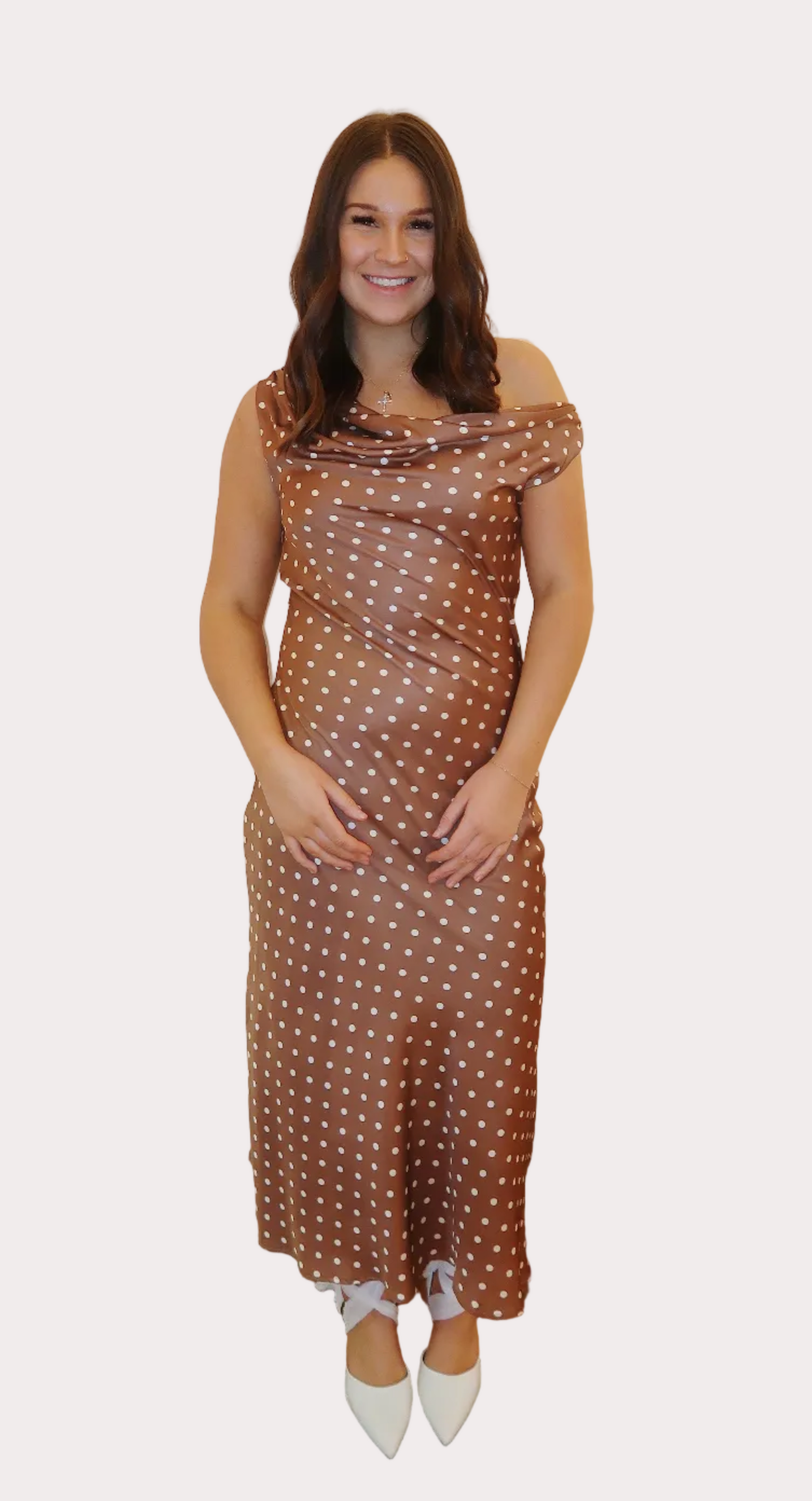 Elegant, soft, and effortlessly flattering—this woven polyester satin maxi dress features a timeless polka dot print and a graceful cowl neckline. The sleeveless design and subtle flared silhouette create beautiful movement, while the smooth rayon lining ensures all-day comfort. Finished with a side zipper for an easy, seamless fit, this dress is perfect for special occasions, date nights, or any moment you want to feel stunning.